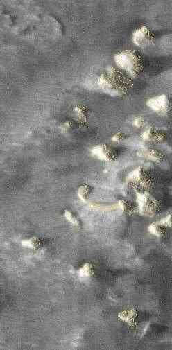 10. ábra. A MOC #04205 sorozatszámú eredeti felvétel az egyik marsi városról. 11. ábra. A MOC #04205 felvétel kontrasztosított változata. Ahogyan az előző felvételt, úgy a következőt is elfelejtették átpixelezni. Így egy újabb marsi várost vehetünk alapos elemzés alá. A kép szintén az MGS jóvoltából jutott el hozzánk, 1999. április 30-án készült, s a Mars déli szélesség 5.95 és keleti hosszúság 72.53 fokánál található területet mutatja 4.79 méteres képpontonkénti felbontással. A felvétel sorozatszáma: MOC #04205 (10 ábra). Holger Isenberg bukkant rá a Marsról érkező felvételek tanulmányozása során. A képen egyértelműen épületek láthatók, szélességük 40 és 200 méter közötti, magasságuk pedig 10 és 100 méter közé esik. Meglehetősen furcsa geológiai eseményeknek kellett volna a Marson bekövetkeznie ahhoz, hogy ilyesfajta épületek megszülethessenek!